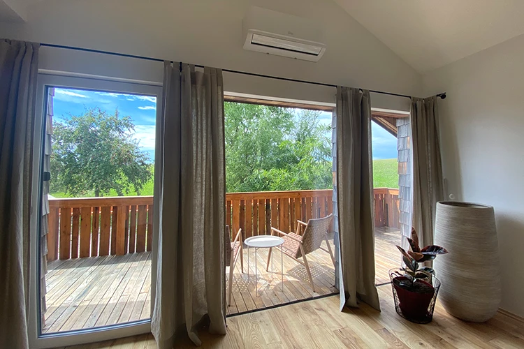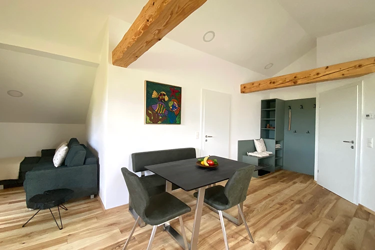 Unsere 53 m² große Ferienwohnungen bieten alles, was Sie für einen komfortablen Aufenthalt benötigen: eine voll ausgestattete Küche mit Kaffeeautomat und Wasserkocher, einen großzügigen Wohn- und Essbereich mit TV, ein separates Schlafzimmer sowie ein Bad/WC mit Föhn. Der gesamte Wohnbereich und das Stiegenhaus sind mit massivem Holzboden ausgestattet, was für eine warme und gemütliche Atmosphäre sorgt. Je nach Wohnung genießen Sie den Aufenthalt auf Ihrem eigenen Balkon oder Ihrer Terrasse. WLAN sowie Bettwäsche sind selbstverständlich vorhanden.