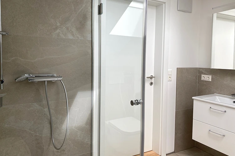 Die hellen Badezimmer mit Dusche und WC bietet Komfort auf kleinstem Raum – funktional, stilvoll und ideal für den täglichen Start in den Tag.